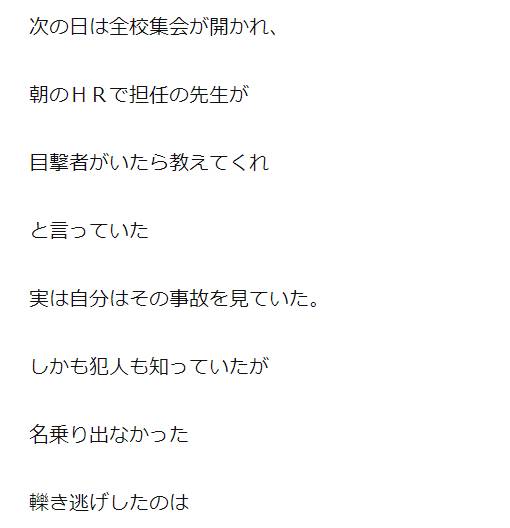学校近くでひき逃げがあった。私は犯人を見ていたが名乗り出ることができなかった。なぜなら….