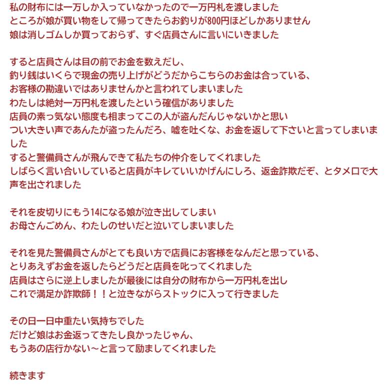 娘が1万円札で消しゴムを買ったのにお釣りが800円しかない。私「お釣り間違ってませんか」店員「は?合ってますけど」私「嘘だ!あんたが盗ったんだろ!」→警備員が来る騒ぎに…
