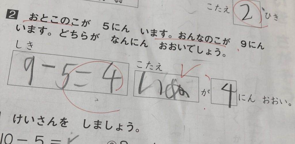 【問題】おとこのこが5人、おんなのこが9人、どちらが何人多い?キッズの回答⇒「いぬが4人多い。」