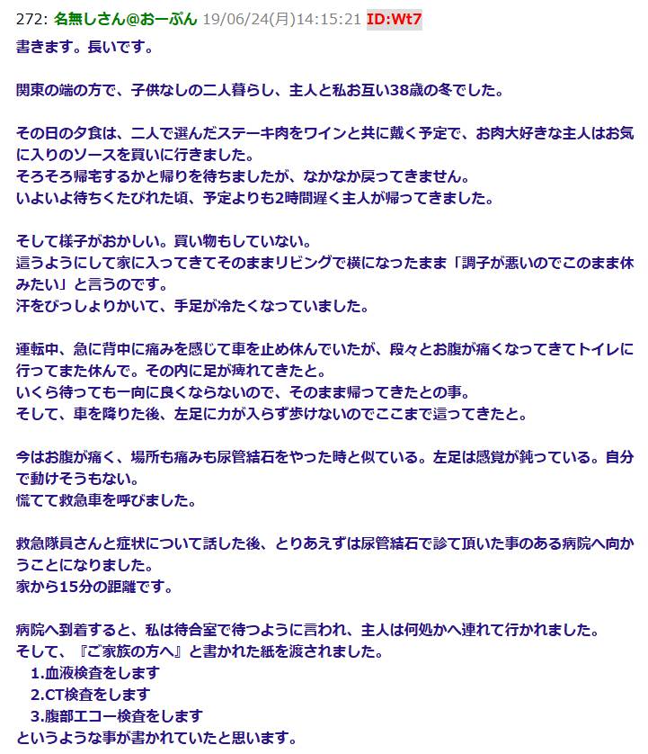 救急車で病院に搬送された旦那→看護士「旦那さん、あちらの科で検査します」旦那「はい..」私『大丈夫なのかな..不安だわ..』→結果