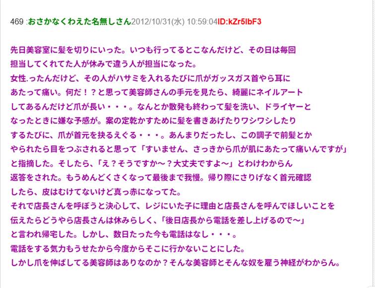 美容室に髪を切りに行ったら美容師の爪がガッスガス首やら耳にあたって痛い → 「すいません、さっきから爪が肌にあたって痛いんですが」と苦言を呈したが…