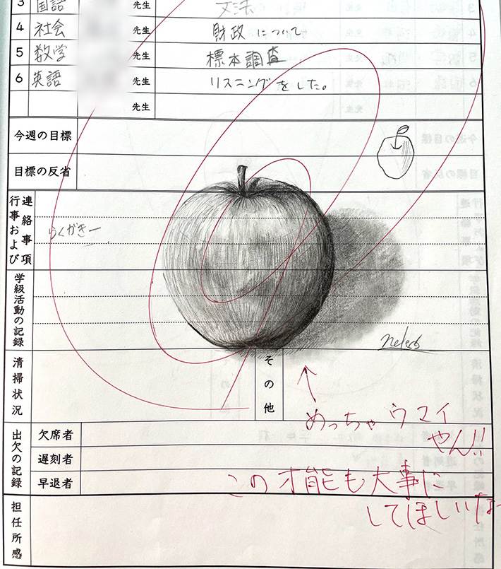 とある中学男子がりんごの絵を日誌に描いたところ先生からは賞賛のコメントが。