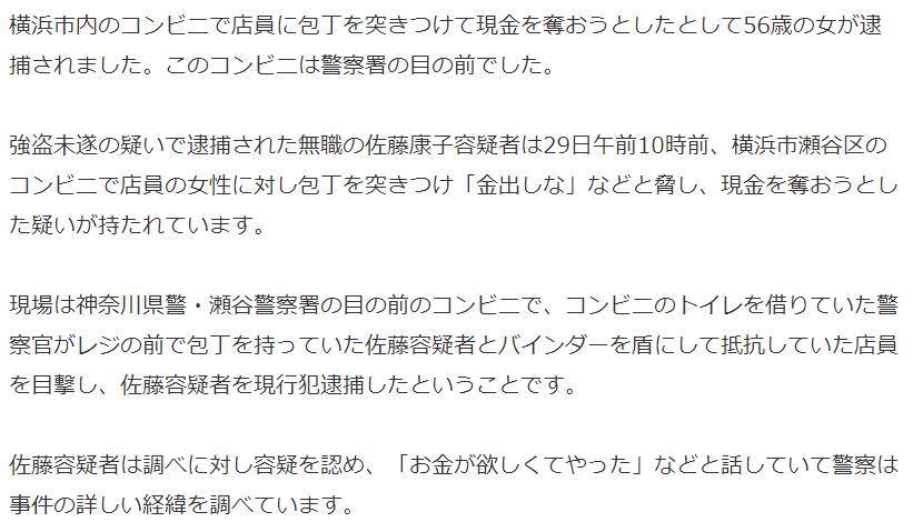 警察署目の前のコンビニで店員に包丁突きつけ「金出しな」 トイレ借りていた警察官が女を逮捕