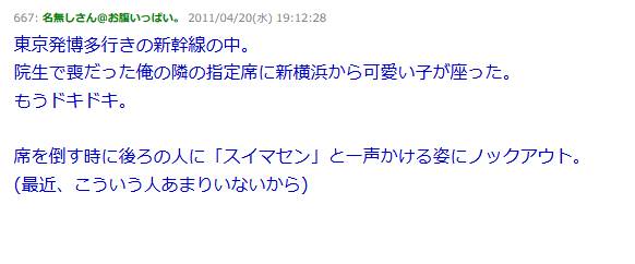 新幹線で、俺の隣席に可愛い子が座った。俺(ドキドキ…チラチラ見てしまう…Zzz…)→ ゴトッという音で目を覚ますと・・・