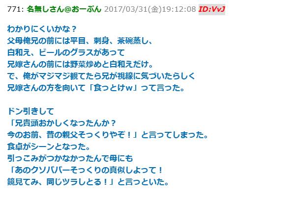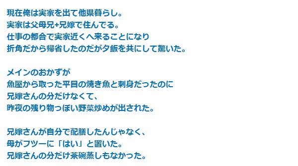 帰省した時の夕飯が、兄嫁だけ残り物の野菜炒めだった。俺「兄嫁さんの刺身と焼き魚と茶碗蒸しは?」母「ないよ」兄「野菜だけ食っとけw」俺「」→結果…