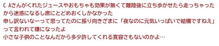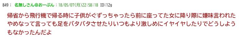 2歳の子供が飛行機の中でグズって足をバタバタ。前の座席をガンガン蹴っちゃって座ってた女に嫌味言われた。小さい子供のすることなんだから大目に見てよ!