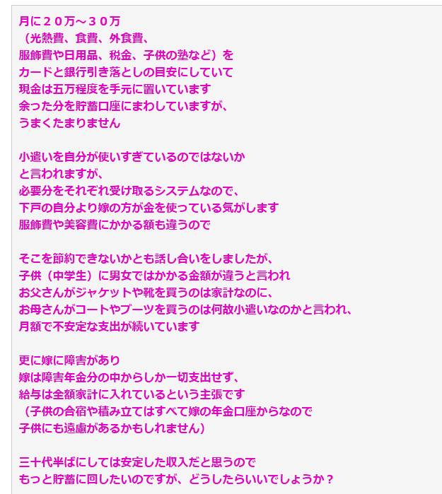 【困惑】世帯年収700〜800万家庭なのに、なぜか貯金できないので、俺「危機感ないね」嫁「アンタが小遣い使いすぎてるから」俺「服飾費や美容費を節約できないのか?」→すると…