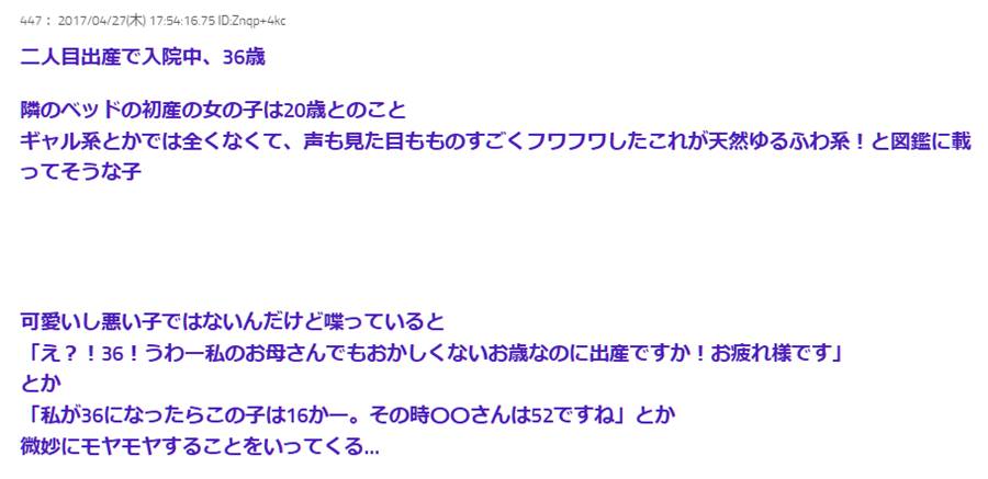 隣のベットの可愛い妊婦(20)「え?!36歳!うわー私のお母さんでもおかしくないお歳なのに出産!私が36になったらこの子は16かー。その時〇〇さんは52ですね」私「…」