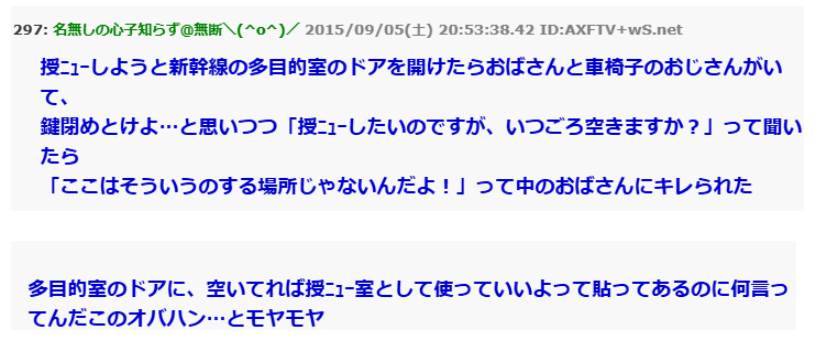 新幹線の多目的室で。私「子供にミルクあげたいのですが、いつごろ空きますか?」婆『ここはそういうのする場所じゃない!』私(何だこの婆) → 車掌に相談すると