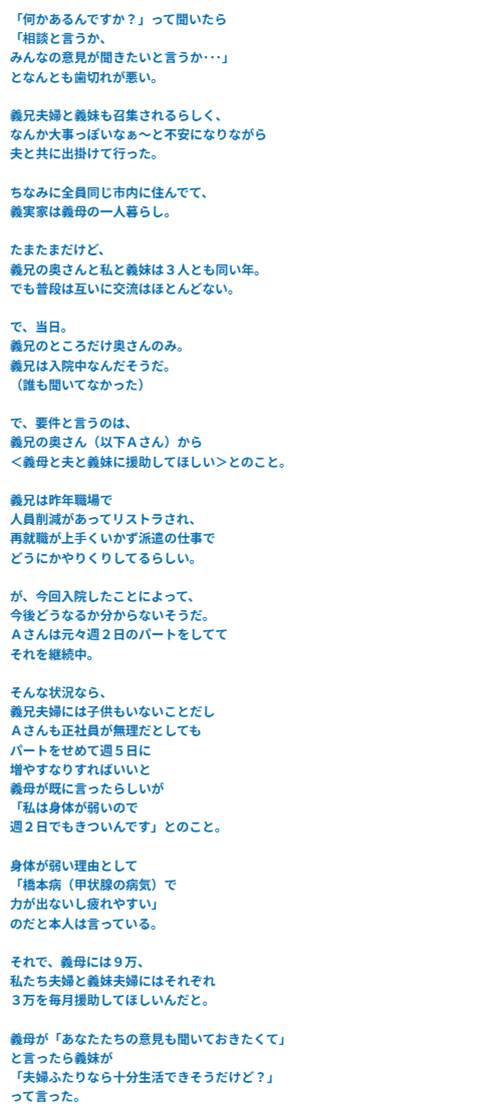 義兄嫁「生活費を援助して欲しい。お義母さんは月9万、あなた達夫婦と義妹夫婦は月3万ね」私達「何で?」義兄嫁「お昼にお菓子しか食べられないほど困ってるんです!」→結果…