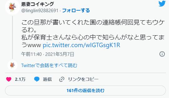 SNSユーザーの悪妻リンリンさんは、子供が通う園との連絡帳をその日は旦那さんに書いてもらいました。